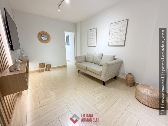 Departamento de 2 ambientes frente al mar. Amplio living comedor. Cocina separada con amoblamiento a medida. Dependencia de servicio con baño. Patio con lavadero. Lavarropas. Lavavajillas. Dormitorio a la calle con vista al mar. Baño completo. Muebles a estrenar. 48 mts. Edificio con quincho y parrilla. Ubicado en Boulevard Maritimo y Luro.
