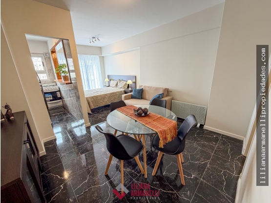 Dólares AmericanosDepartamento de 1 ambiente totalmente reciclado. Contrafrente abierto. Balcón saliente. Cocina separada por barra desayunadora y ventilación natural. Heladera. Lavarropas. Placard. Baño completo con mampara. Muebles a estrenar. 28 mts. Ubicado en Gascón y Arenales.