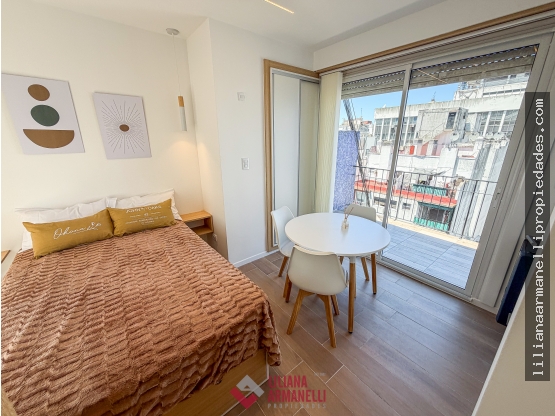 Dólares AmericanosDepartamento de 1 ambiente reciclado. Amplio. Cocina con amoblamiento a medida. Heladera. Placard. Balcón terraza. Balcón al cfte. Baño completo con mampara. Muebles a estrenar. 28 mts. Ubicado en Plaza Colón.